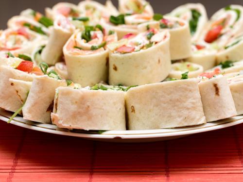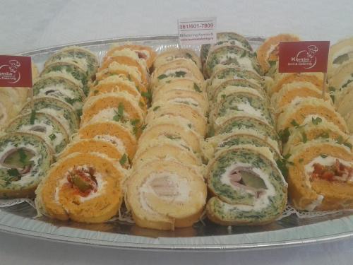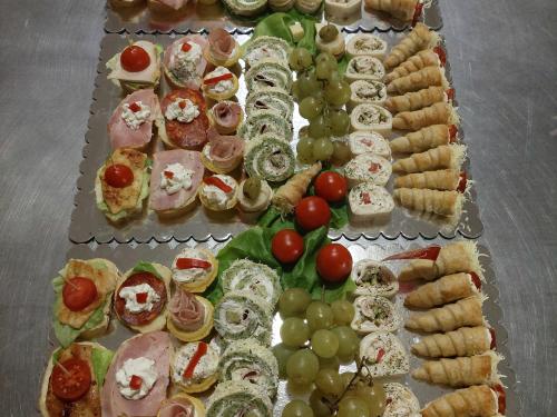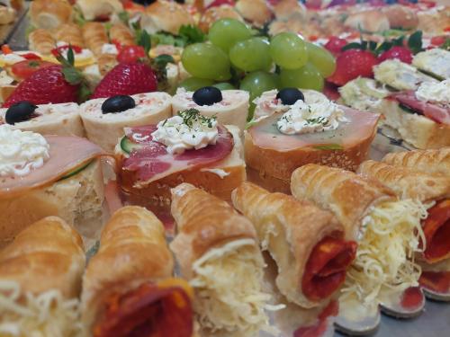 Posni fišeci, sendviči, korpice, tortiljaPecivo servirano na tacnama sa dekoracijom